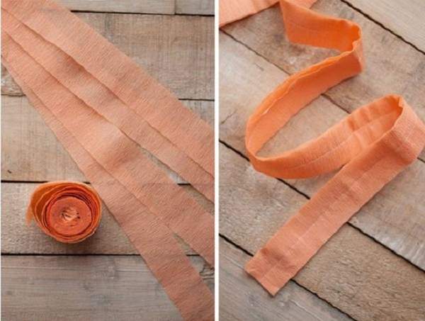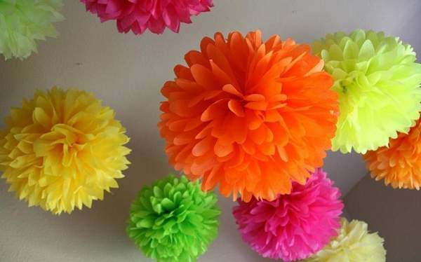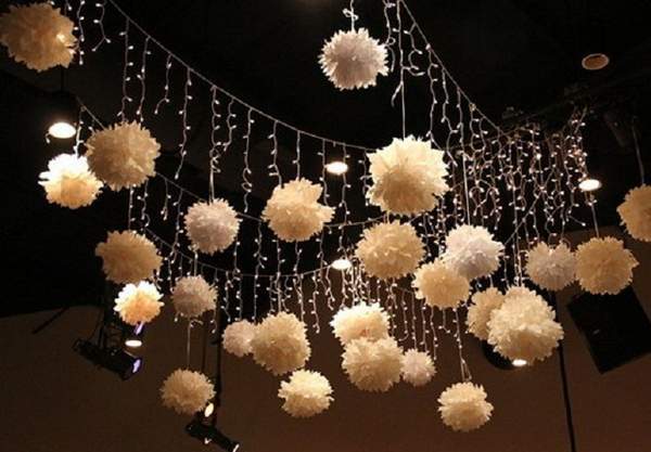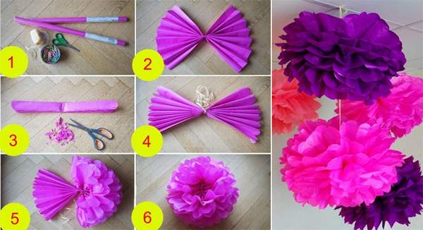 Из гофробумаги можно также сделать пушистые разноцветные шары и сформировать из них подвесы или гирлянды. Для этого нужно взять одинаковые листы (можно штук 10) и сложить их друг на друга, после чего вся пачка вместе складывается гармошкой и перевязывается по центру тесьмой с образованием петельки для подвеса. Оба конца закругляем ножницами. Растягиваем бумагу в стороны, как показано на фото и начинаем формировать шар, поднимая половину листов вверх, а половину опускаем вниз до получения нужной формы.