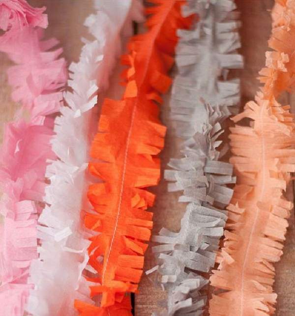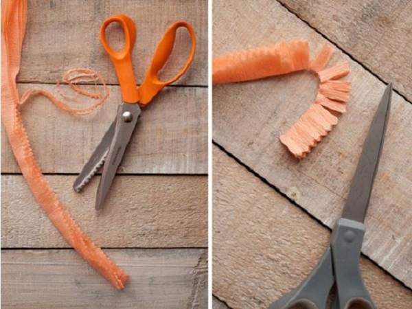 Гофрированная бумага — недорогой и удобный в работе материал, из которого можно изготовить красивые воздушные новогодние бумажные гирлянды. Чтобы изготовить красивое украшение с бахромой, необходимо взять рулон гофробумаги и разрезать его поперек на несколько небольших рулончиков, размотать их, сложить друг на друга и сшить, как показано на фото. Затем края лент сгибаем пополам и делаем надрезы, не задевая шва по центру. Расправляем и получаем пушистые новогодние гирлянды из гофробумаги.