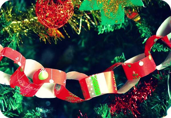 Самый простой и доступный детям способ — это изготовить новогодние гирлянды из бумаги своими руками в виде цепочки. Для этого необходимо вырезать одинаковые полоски цветной двухсторонней бумаги и аккуратно их склеить. Сначала формируется первое звено путем склеивания концов одной полоски. Следующая полосочка продевается в предыдущее звено, и также склеиваются ее концы. При этом необходимо чередовать цвета, чтобы цепочка получилась более эффектной.