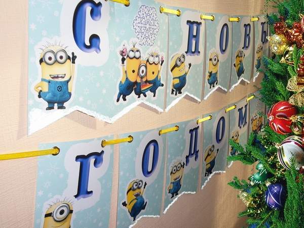 Детишкам наверняка понравятся новогодние гирлянды своими руками, на которых будут изображения их любимых героев мультфильмов и сказок. Оформить такие украшения можно несколькими способами. Например, как показано на фото, сделать отдельные квадратики с буквами поздравления и дополнить каждую из них забавным миньончиком или другим персонажем. Для того, чтобы сделать гирлянды новогодние растяжки с вырезанными мульт героями, можно воспользоваться фотографиями из нашей статьи и многократно распечатать любимого персонажа. Затем вырезать изображения и склеить между собой, чтобы получилась гирлянда.
