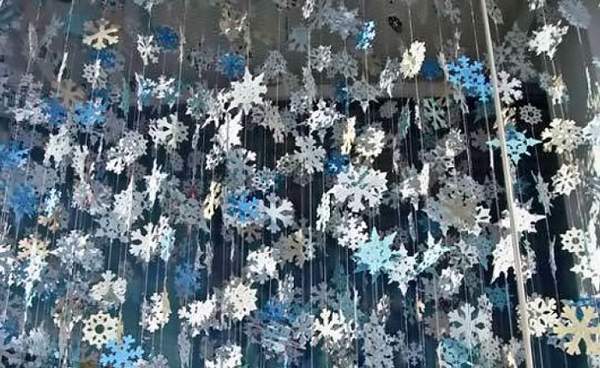 Очень красивый способ оформления интерьера — использование подвесов, когда на длинную нить или мишуру крепится множество нитей с украшениями. Самый простой способ, как сделать новогоднюю гирлянду-подвес из цветной бумаги — это вырезать различные звездочки, елочки или снежинки, а затем, с помощью иголки нанизать их на нити (можно разной длины). Эти отдельные подвесы крепятся к длинной веревке, мишуре или светодиодной гирлянде. И вот — новогоднее украшение готово.