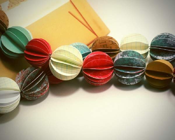 Можно изготовить объемные шарики и составить из них новогодние гирлянды из бумаги своими руками. С помощью циркуля рисуем на картоне круг и вырезаем — это будет шаблон. По нему вырезаем много кружков из бумаги разных цветов (или чисто белого). Для каждого объемного шара понадобится по четыре таких заготовки. Складываем их пополам и склеиваем ребрами, не забывая прокладывать в середине нить. На подвесе может быть один шарик или несколько, как вам нравится. Их трех шариков можно сформировать снеговичков.