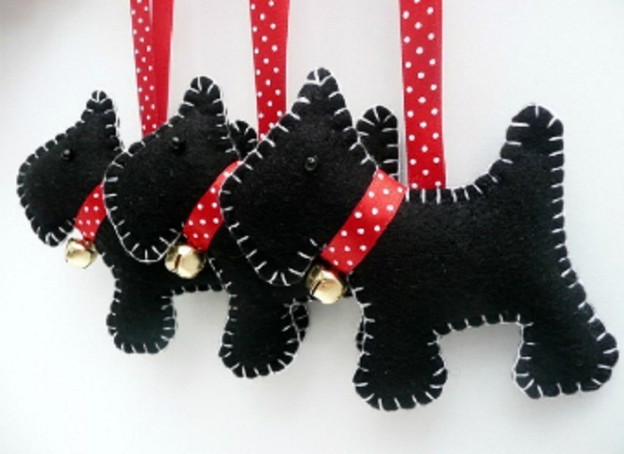 Символом наступающего года является Желтая Собака, в интерьере обязательно должна присутствовать соответствующая символика. Если Вы хоть немного умеете шить, создать новогодние игрушки и гирлянды своими руками из фетра будет совсем несложно. Например, можно сшить маленьких собачек, символизирующих наступающий год, как показано на фото в нашей статье. Можно сделать и отдельное украшение интерьера. Натяните прочную нить на стене вдоль потолочной поверхности, обмотайте ее мишурой и, чередуя между собой, подвесьте к ней собачек и косточки, так же вырезанные из фетра и обметанные. Такие новогодние гирлянды своими руками на 2018 год значительно оживят интерьер, привлекут к себе внимание гостей и, наверняка, задобрят хозяина года, что поспособствует благополучию в семье.