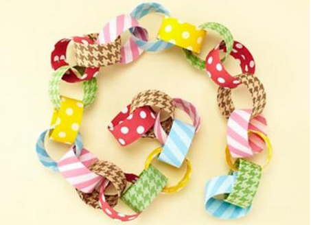 Это наиболее простая гирлянда, сделать которую сможет и ребенок. Кстати, изготавливать новогодние украшения гирлянды своими руками вместе с детьми очень полезно и интересно. Итак, необходимо вырезать из цветной бумаги тонкие (не более 1 см шириной) полоски, длина которых зависит от того, какими Вы хотите видеть звенья. Важно, чтобы полоски были одинаковы — тогда цепочка будет ровной и красивой. Склеиваем концы первой полоски, чтобы получилось звено. Следующую — продеваем в него и также склеиваем концы. Таким образом, формируем цепочку необходимой длины, которой впоследствии можно украсить елку, стены, оконный проем или подвесить спускающимися волнами к потолку с помощью скотча.