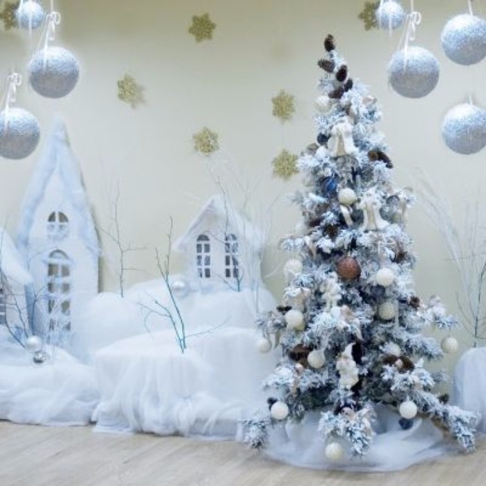 В преддверии Нового года во всех детских учреждениях проводятся утренники, и создать детишкам необходимую праздничную атмосферу — дело рук персонала и родителей. Например, можно сделать красивые новогодние гирлянды своими руками в детский сад из цветной бумаги. Вырежьте звездочки, елочки, снежинки различных размеров и нанизайте с помощью иголки их на нити. Такие гирлянды необходимо разместить как можно ближе к потолочной поверхности, чтобы дети не могли их случайно порвать. Также можно сделать новогодние гирлянды из шаров своими руками. Фотографии разнообразных украшений мы собрали в нашей статье. На одной из них видно, как украшен актовый зал садика с гирляндами из белой мишуры и снежинок-подвесов.