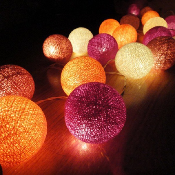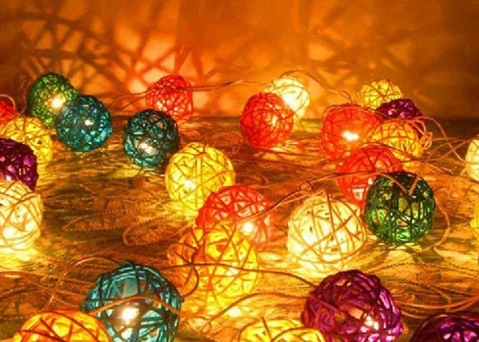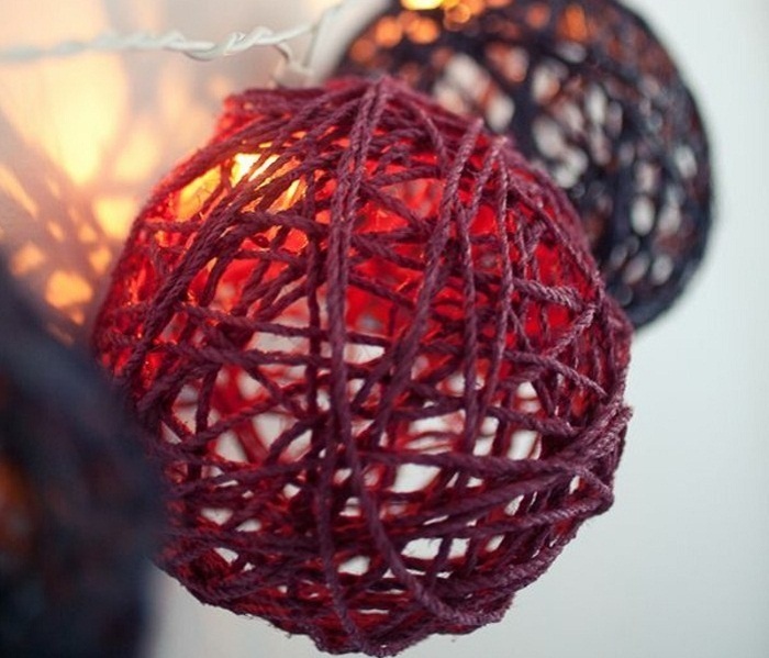 Самый простой вариант — это создать из гирлянды определенную картинку, например, силуэт собаки, деда мороза, снеговика или просто абстрактную форму. Но светодиодные новогодние гирлянды своими руками можно превратить в особые украшения, которые по достоинству будут оценены гостями. Например, с помощью ниток, воздушных шариков и клея ПВА, можно смастерить разнообразные прозрачные легкие плафончики, которые украсят каждую лампочку гирлянды. Делается все очень просто: надуваем воздушный шарик (совсем немного) и фиксируем, нить обмакиваем в клей и неплотно наматываем на шар. После полного высыхания, шарик лопается и достается из плетеного плафона, который, в конечном итоге, нужно зафиксировать на лампочке. Такие новогодние гирлянды своими руками (фото смотрите в статье) в вечернее время будут создавать самые неимоверные узоры в интерьере комнаты.