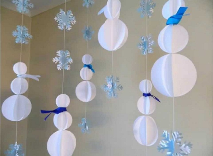 Чтобы сделать новогодние бумажные гирлянды-снеговички своими руками, шарики делаются по тому же принципу, но разных размеров. Крепятся на нить плотно друг к другу по величине: большой, средний и маленький, как показано на фото.