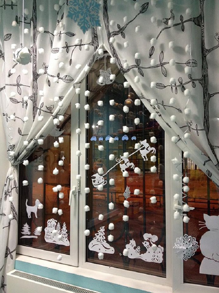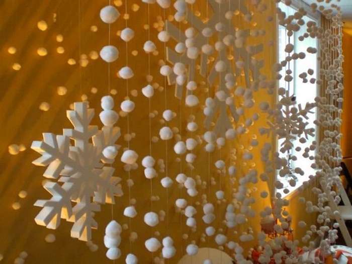 Самый настоящий снегопад довольно просто оформить, если сделать отдельно новогодние подвески и гирлянды своими руками из ваты и густо разместить их на одном участке стены или потолка. Чтобы сделать одну такую гирлянду, нужно взять небольшие кусочки ваты и обворачивая ними нить, плотно обкрутить кончики, по принципу конфетной обертки. Для надежности можно концы смочить клеем ПВА. Гирлянда получится пушистой и легкой.