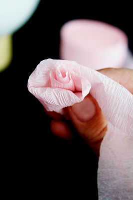 Нарезаем гофрированную бумагу на неширокие полоски, из которых формируем бутоны роз (см. фото), каждый бутон снизу обвязываем ниткой, чтобы не распустился. После того как необходимое количество цветов будет готово, приклеиваем бутоны при помощи клеевого пистолета к основанию пенопластового шара, плотно стыкуя друг к другу, не оставляя просветов.