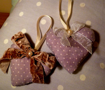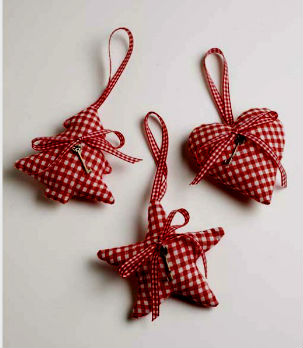 На подходящей ткани, при помощи шаблона (для одинаковых по форме и размеру игрушек) вырисовываем елочку, звездочку, сердечко или рождественский леденец. После чего сшиваем две тканевые стороны наизнанку вместе, сшив изделие в ручную или на швейной машинке, выворачиваем, набиваем ватой или синтепоном, зашиваем отверстие и декорируем изделие бантиками, стразами, бисером или лентами.