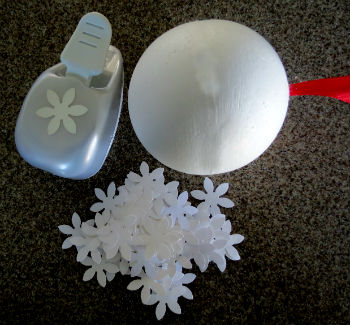 Из белой плотной бумаги подготавливаем большое количество фигурных конфетти, к шарику приклеиваем атласную ленту, и начинаем прикладывать конфетти, попутно закрепляя их булавками с шапочками-бусинками.