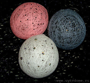 Берем пластиковый стаканчик, иглой в самом низу (см. фото) проделываем сквозные отверстия, в которые продеваем нить, затем в данный стаканчик вливаем клей ПВА, после чего надуваем шарик или медицинский напальчник, завязываем, чтобы не сдувался, и начинаем в беспорядке обматывать нитями. Оставляем сушиться на 24 часа, затем аккуратно прокалываем шарик иглой, ждем когда он спустится, вытаскиваем его и используя прозрачный клей момент, украшаем изделие стразами.
