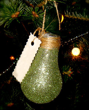 Простой способ №1. Покрываем лампочку слоем клея ПВА и обильно посыпаем изделие блеском, цоколь лампочки обматываем бечевкой, не забывая создать веревочку-подвеску для еловой ветки. Дополнить изделие можно небольшой карточкой с новогодними поздравлениями.