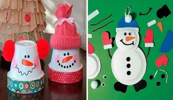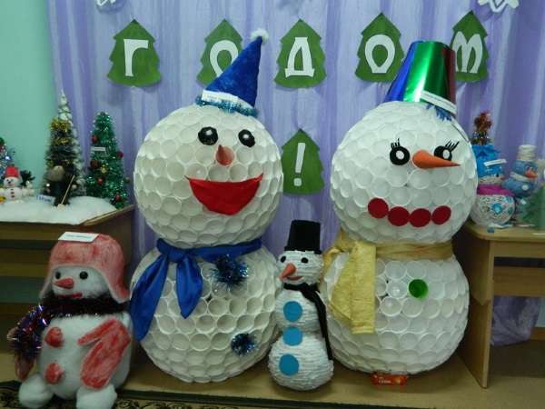 Оригинальным и красивым вариантом новогодней поделки своими руками в школу станет снеговик из пластиковых стаканчиков. Для этого Вам будет необходимо приобрести две или три большие упаковки пластиковых стаканчиков, степлер со скрепками или клей. После этого можно приступать к работе.