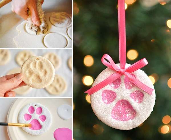 Если у вас есть четвероногий друг, то с помощью его отпечатка можно сделать потрясающую елочную игрушку. Для этого сначала необходимо замесить соленое тесто, затем раскатать и вырезать из него круглые кусочки. Далее надо отпечатать лапку собачки на кружочке и покрасить оставленный след блестящим лаком или простыми красками. Завершающим этапом следует вставить ленточку в поделку, для того чтоб можно было без труда ее подвесить.