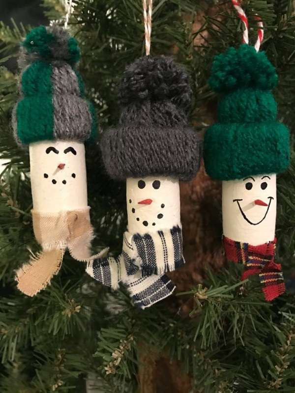 После того, как все сегменты будут готовы, скрепите их между собой, используя клей или степлер. Затем приступите к украшению снеговика. Для этого наденьте на поделку шарф (он поможет скрыть место соединения сегментов) и шапку, вставьте покрашенные соответствующим образом теннисные мячики в отверстия для глаз и пуговиц, используя пластилин или цветной картон, смастерите нос.