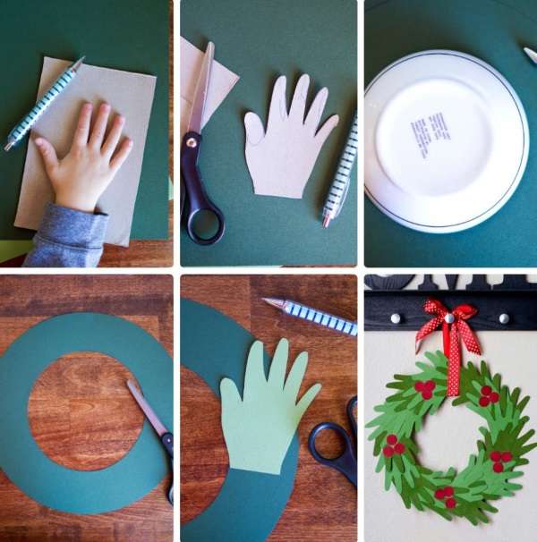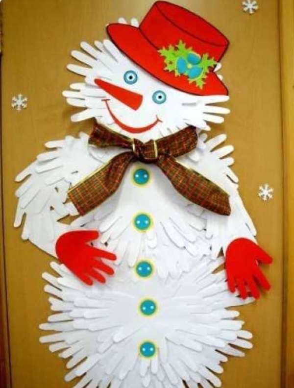 Обязательно задействуйте в этом веселом процессе деток. Это одновременно станет для них развивающим занятием и интересным делом. Например, вы можете предложить каждому из них обвести свою ручку на листе картона или бумаги, а затем аккуратно вырезать ее ножницами. После того, как все детки закончат вырезать, можно собрать из этих картонных ладошек ёлочку или снеговика. По желанию на отпечатке можно написать новогоднее поздравление.