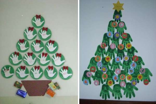 Или же, как вариант, предложить детям обмакнуть ладошку в краску и расставить свои отпечатки в виде елки. Как это выглядит, а также другие варианты новогодних поделок своими руками в детский сад смотрите далее на фото.