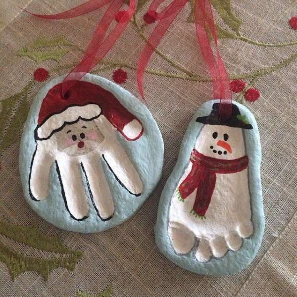 Еще одним интересным вариантом станет детская новогодняя поделка, сделанная из соленого теста. Ваша крошка с удовольствием оставит отпечаток ручки и ножки на круглом куске. А далее, отпечаток ладошки можно преобразить с помощью красок в деда мороза, а отпечаток ножки в снеговика.
