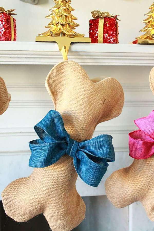 Также можно подготовить гостинец символу 2018 года. В качестве угощения вы можете сшить кость из мешковины или другой ткани, а затем украсить ее бантиком. На фотографиях ниже смотрите новогодние поделки своими руками в год собаки.