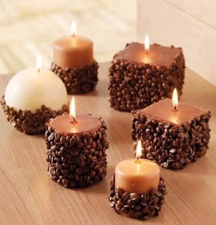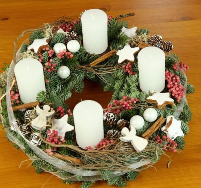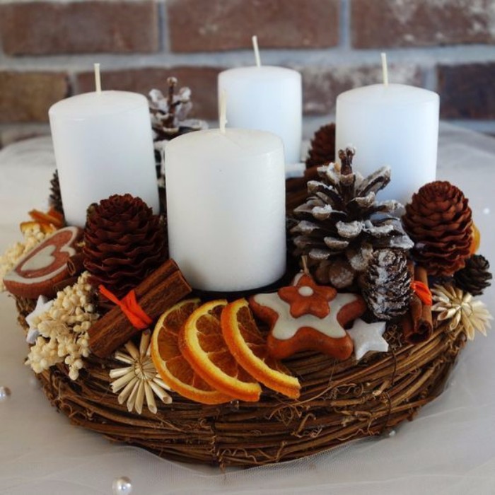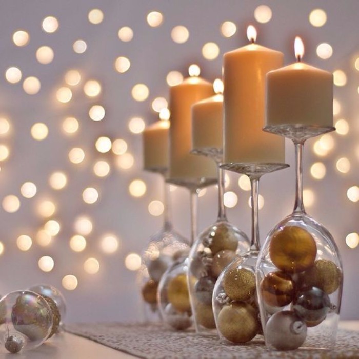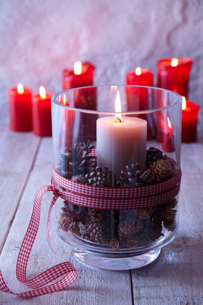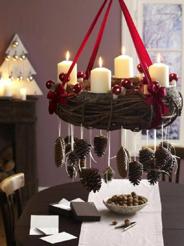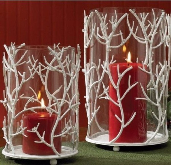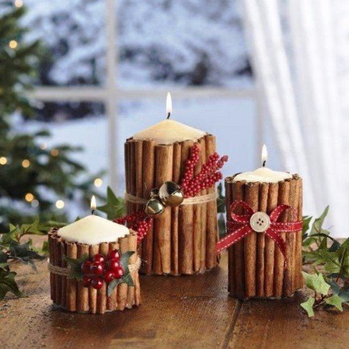 Свечи являются одним из древнейших атрибутов празднования Нового года. Подберите несколько свечей разных размеров и установите на блюдце, дополните композицию зеленой мишурой или ветками ели, яркими новогодними шарами, шишками, украшенными блестками. Для того, чтобы элементы не рассыпались, их можно аккуратно соединить каплями термоклея. Можно сделать новогодний декор свечей, используя палочки корицы. Свечку лучше взять большого диаметра, а палочки не должны превышать ее изначальную длину. Палочки поочередно прикладываем вдоль свечи и фиксируем все войлочной веревкой. Помимо оригинального оформления, комната будет дополнена превосходным ароматом.