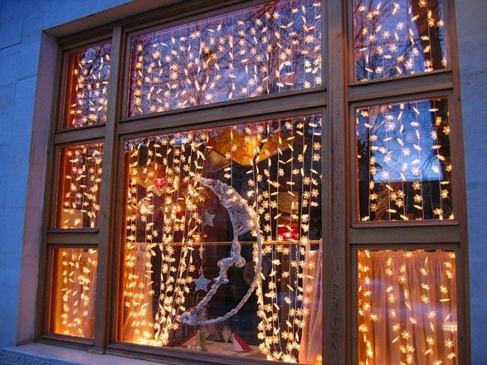 Окно — это «лицо» квартиры, по которому прохожие судят о ее хозяевах. Украшая жилье, стоит позаботиться и том, чтобы красиво оформить новогодний декор окон. Это можно сделать с помощью аппликаций на окнах, вырезав из бумаги снежинки, звездочки, елочки и приклеив их к стеклу. Очень удобно воспользоваться трафаретом и нарисовать с помощью зубной пасты на окне настоящую картину. Идеи для новогоднего декора окон предоставлены на фото в нашей статьи, где видно, какие можно сделать игрушки-подвесы, композиции из сказочных персонажей, гирлянды. Особый уют в комнате создаст небольшой, вырезанный из бумаги и оснащенный гирляндой, белый лес на подоконнике. Кстати, светодиодную гирлянду можно разместить по всему периметру окна или же в виде падающих огоньков, что, несомненно, будет поднимать настроение прохожим.
