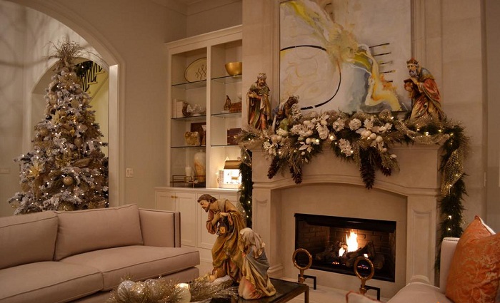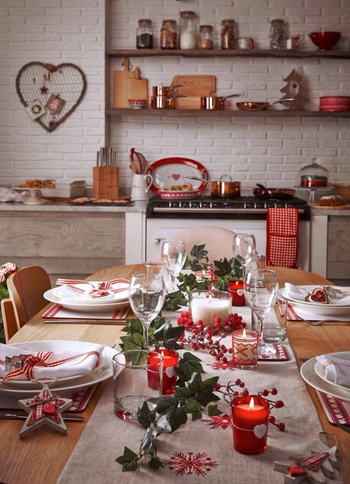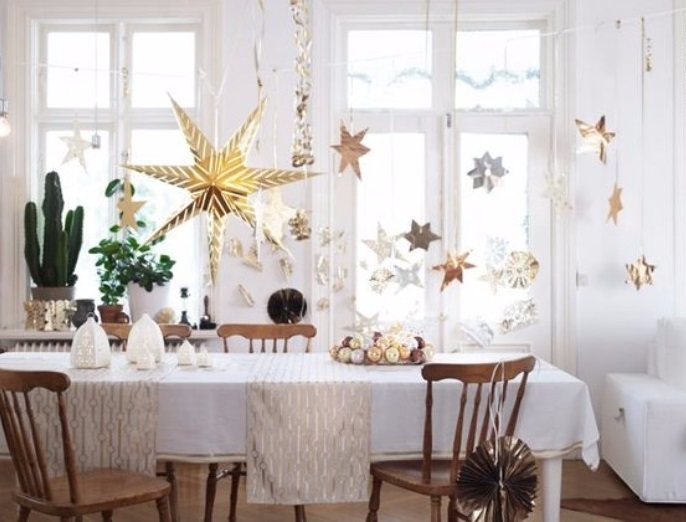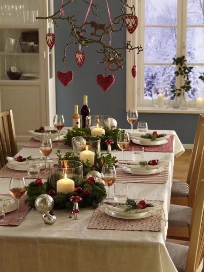 Елка, как главный атрибут праздника, устанавливается в большинстве случаев, в гостиных, чтобы радовать своим присутствием не только домочадцев, но и гостей. Однако, небольшие букеты из еловых веток можно расставить и в других помещениях, украсив их при этом гирляндами и игрушками. Новогодний декор комнаты будет выглядеть намного уютней, если красиво оформить оконный проём, создав на подоконнике сказочную композицию. Двери, как правило, украшают рождественскими венками, которые можно приобрести или сделать собственноручно из хвои, добавив ягоды красной калины, шишки, золотые бусинки и другие элементы. Украсить перила лестниц в частном доме помогут новогодние гирлянды, фото которых Вы можете найти в статье, а стены и потолок будут выглядеть совершенно по-новогоднему, если украсить их разноцветными светодиодными лентами и подвесами. Отдельной составляющей новогоднего интерьера станет и праздничный стол. Его украшением станет роскошная скатерть, новогодний декор свечей, а также композиции из природных материалов.