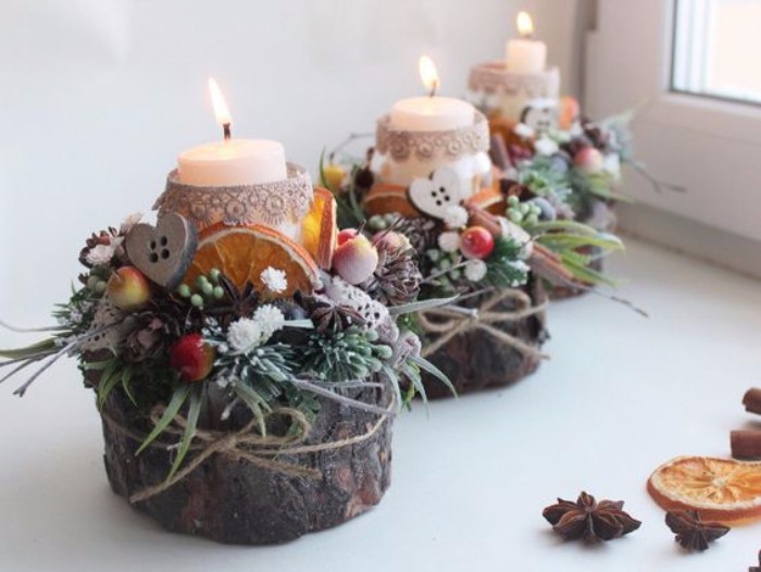 Какой бы вы не задумывали новогодний декор из дерева (веток, пеньков и т. д.) материал необходимо покрыть лаком, чтобы он не подвергался внешним воздействиям. Тонкие ветки способны хорошо гнуться и это позволит сплести из них разнообразные украшения — подставки для декоративных композиций, рождественские венки и пр. Небольшие пеньки могут послужить основой для свечей-таблеток, приобретая вид своеобразных подсвечников. Большую сухую ветвь дерева можно установить в вазу, вскрыть лаком, присыпать шариками пенопласта или искусственным снегом и украсить светодиодной лентой.