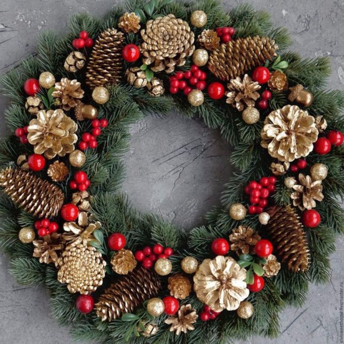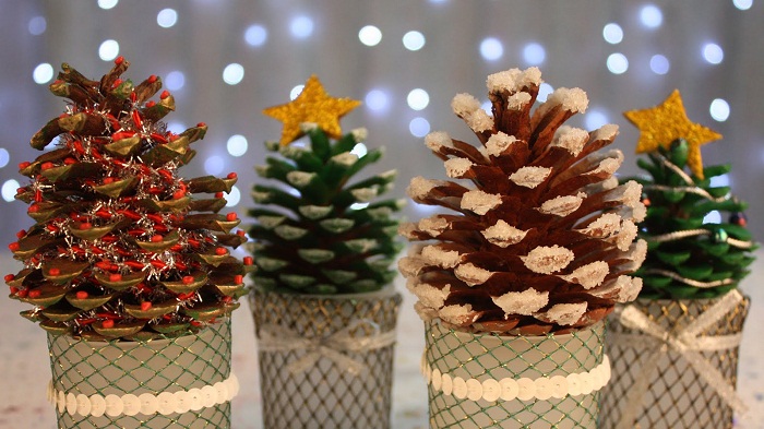 Для того чтобы сделать украшения из шишек могут понадобиться краски (гуашь или акриловая), термопистолет и различные блестки. Самый простой новогодний декор из шишек может быть сделан в виде маленьких елочек, которые украсят торжественный стол. Необходимо взять шишки больших размеров, окрасить их в зеленый или белый цвет, после высыхания вскрыть лаком и присыпать блестками. Готовое изделие поместить в маленький горшочек. Из шишек можно сформировать рождественский венок, склеивая их в нужную форму с помощью горячего клея или же сконструировать елку. Разнообразный новогодний декор представлен на фото в нашей статье.