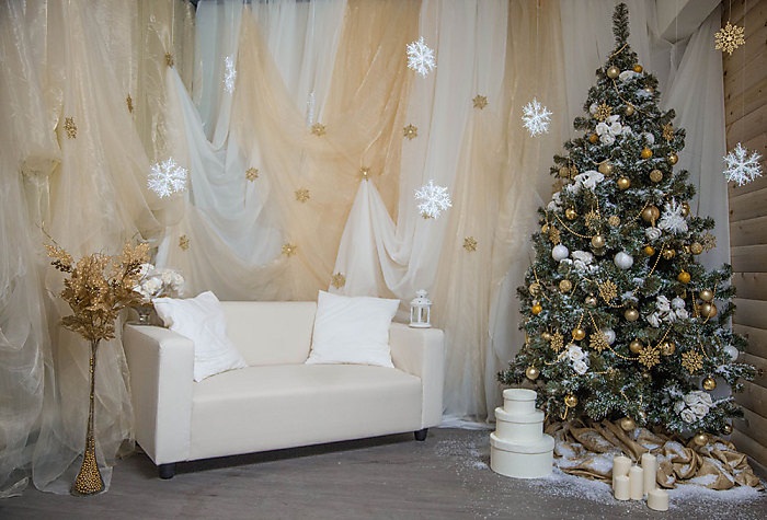 Красиво, по-новогоднему убранная комната может стать прекрасным поводом, для того, чтобы запечатлеть торжественность встречи Нового года. Камин, украшенный гирляндами и подвесами, нарядно убранная елка и горы подарков — такой новогодний декор для фотосессии будет смотреться очень выигрышно. В центре композиции можно установить кресло или же раскинуть мягкий ковер возле елки, на котором разместится вся семья.
