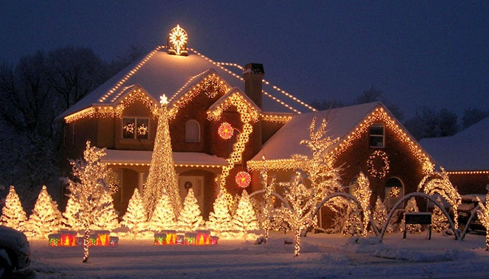 У обладателей частных домов есть дополнительные возможности украсить свою придомовую территорию. Торжественно оформить центральный вход помогут гирлянды, сделанные собственноручно из мишуры, ярких шаров, золотых бантов и прочих украшений. Такой новогодний декор размещают на перилах, обрамляют ним входные двери и различные малые архитектурные формы на придомовой территории. Он прекрасно будет смотреться в дневное время. Для того, чтобы уличный новогодний декор для дома имел эффектный вид и в новогоднюю ночь, можно приобрести различные светодиодные гирлянды, которые создадут потрясающе сказочную атмосферу. Ими также украшают периметры оконных проемов, крыши, заборы, дорожки, расположенные на участке деревья, кустарники и прочее.