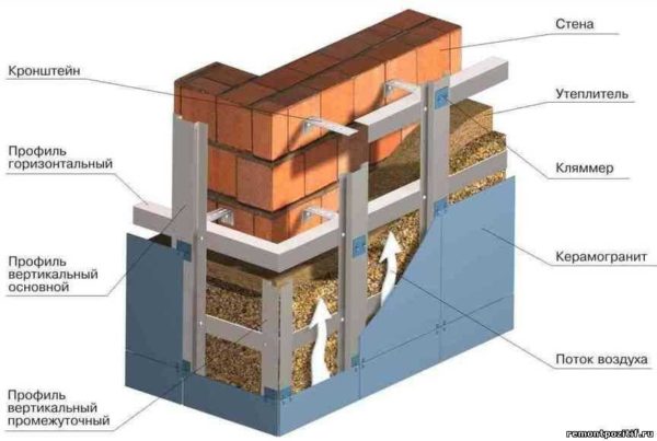 По этому принципу монтируется большинство вентилируемых фасадов, к которым относятся все или почти все фасадные панели для наружной отделки дома. Отличается форма профилей и кляммеров, шаг установки, все остальное очень и очень похоже.