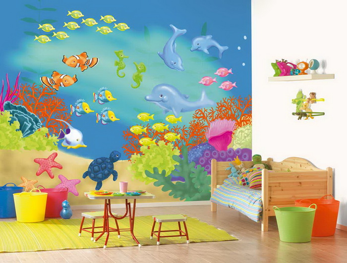 Фотообои очень красивы, на них обычно изображены различные красивые рисунки, помогающие умственному развитию. Лучше их разместить кусками, как картинки. Их основой является целлюлоза, их легко чистить и заменять.