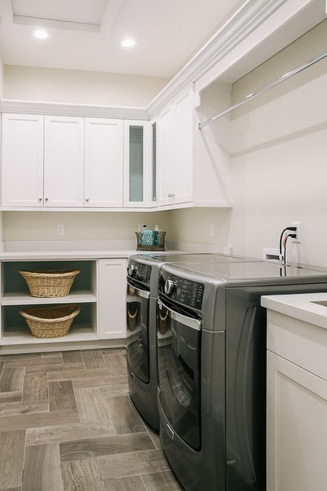 Зачем искать место для стиральной машины в ванной или кухне, даже если эти комнаты достаточно просторны, если подвал простаивает без дела? Оформить здесь отдельную прачечную можно буквально за пару дней. Так, у вас будет достаточно места не только для стиральной машины и большой корзины для белья, но и отдельных шкафчиков для стиральных порошков и бытовой химии, а также для стиральной доски и даже сушки белья.