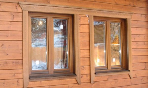 Используются деревянные наличники, как со стороны улицы, так и в помещении. Просто при установке применят разные защитные пропитки и красящие составы.