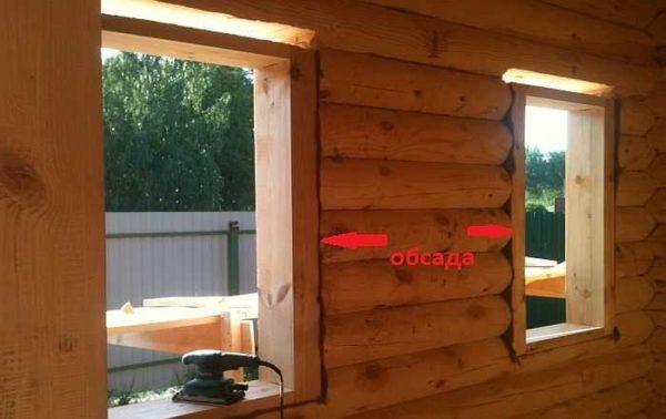 В брусовом или бревенчатом доме окна и двери ставятся на обсаду — специальное обрамление проема из древесины, которое не закреплено жестко со стенами, а держится за счет силы трения в замке типа гребень/паз. Делают обсаду из толстого деревянного бруса. Рама окна или двери крепится в обсаду. При установке наличников их тоже крепят к обсаде. Так как нагрузки на них никакой, то обычно планки крепят с двух сторон, отступив 10-15 см от края.