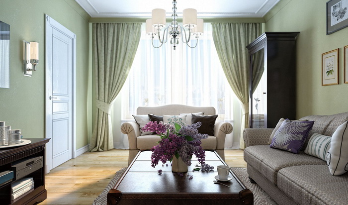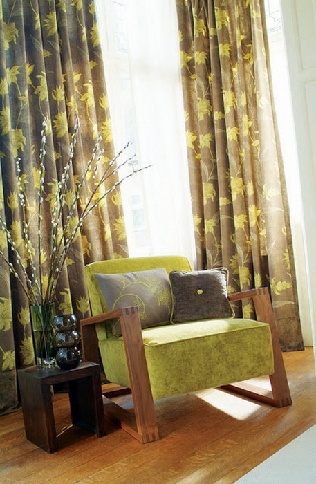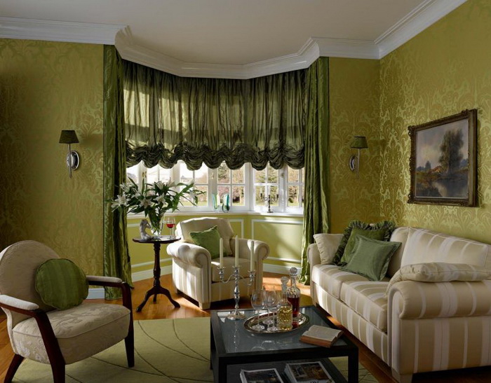 Также встречается вариант использования оливкового не в основной отделке комнаты, а для создания яркого  цветового пятна. Это могут быть темно-зеленые шторы с классическим рисунком, небольшое кресло или диван, вазы и светильники с тканевыми абажурами.