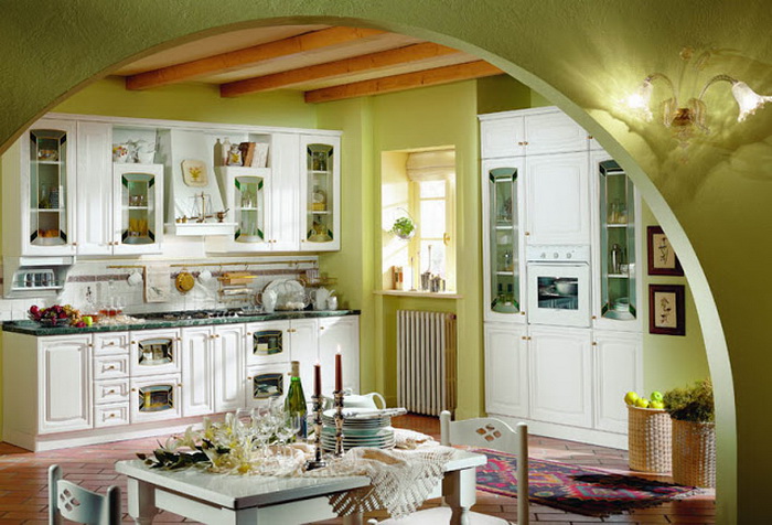 В кухне кантри оливковый прекрасно смотрится в сочетании с коричневой или белой столешницей, голубым или песочным фартуком. На открытых полках многие хозяйки размещают расписную посуду, баночки со специями.