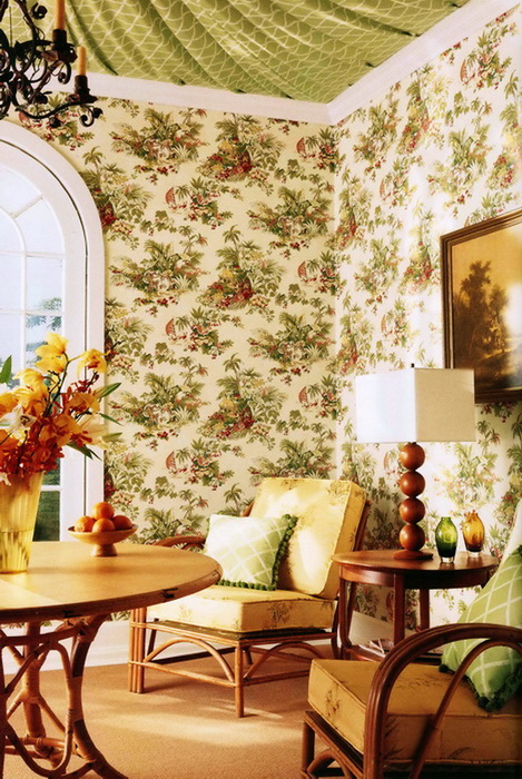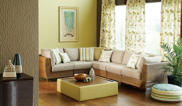 Здесь приветствуются только натуральные материалы. Часто в этом стиле мебель из ротанга. На полу размещают бамбуковые циновки. В качестве обоев часто применяют пробковое покрытие. А в качестве стульев используют обычные пеньки, обработанные грунтовкой.