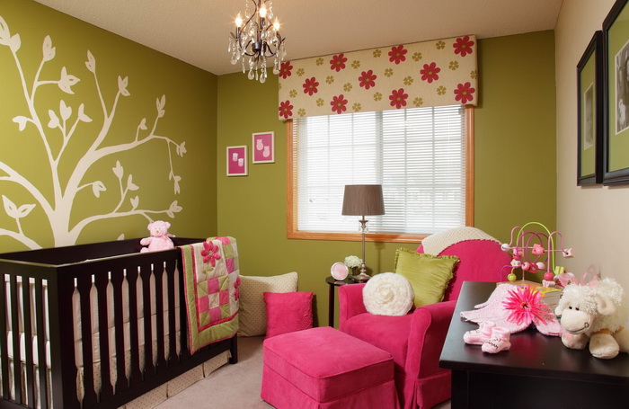 Для того, чтобы придать интерьеру живость, в обстановку добавляют контрастные аксессуары. Модным и необычным решением послужит яркий малиновый диван в сочетании с темно-зелеными стенами.