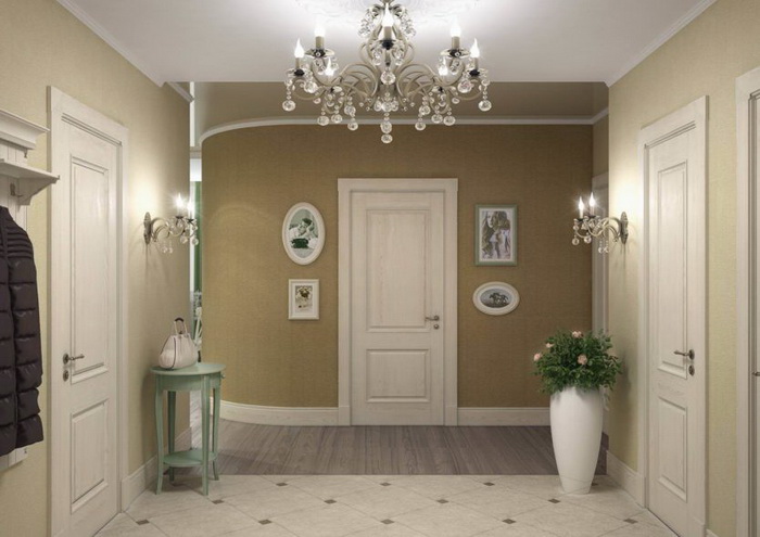 Визуально увеличить площадь прихожей можно, если для пола выбрать светлую плитку и  диагональную раскладку.