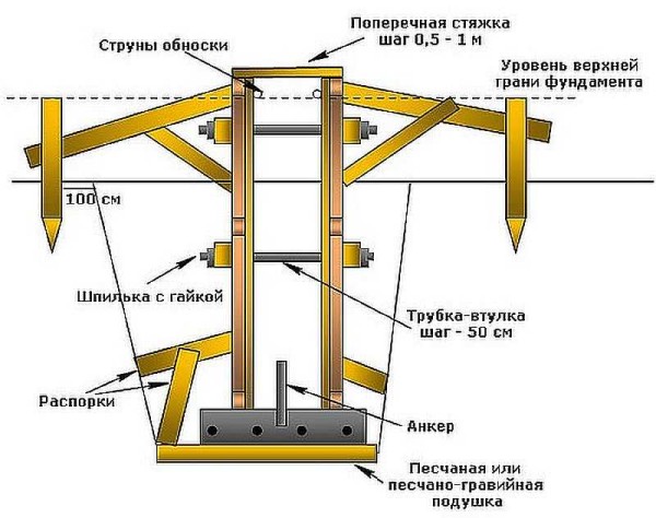 Снаружи опалубки ставят упоры и раскосы. При большой высоте их делают в несколько ярусов. Обратите внимание на толщину опорного бруса