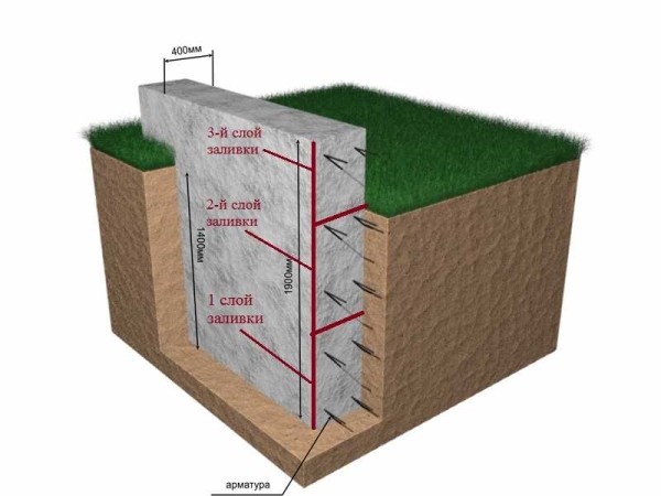 Если фундамент имеет большую глубину залегания, его можно заливать двумя-тремя частями, разделив по вертикали на примерно равные доли