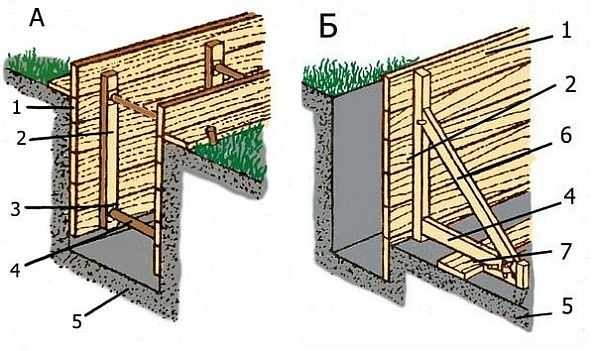 Если щиты сделаны без длинных брусков, на дне котлована, по линии разметки ленты, закрепляют брусок, который будет служить упором. Щиты приставляются к нему вплотную, потом при помощи укосов и распорок фиксируются.