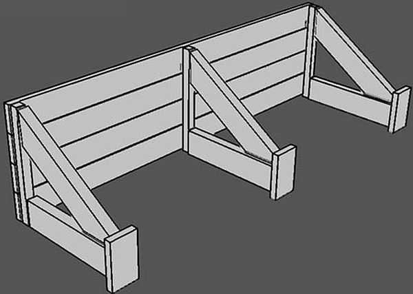 Снаружи устанавливают раскосы. Подпорки должны стоять не реже, чем через метр. Особое внимание нужно уделять углам: тут ставят упоры в обе стороны. Если высота щита больше 2 метра, то одного пояса упоров недостаточно. В этом случае делают как минимум два яруса распорок: верхний и нижний.