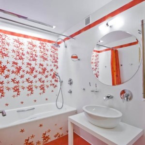Помимо этого, удачным вариантом будет совмещение апельсиновой и белой палитры. Такое сочетание придаст интерьеру ванной чувство свежести, чистоты, легкости и прозрачности.