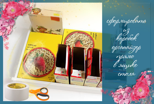 Для начала выдвигаем ящик стола (данный органайзер будет делаться под него), если вы не планируете ставить его в отсек стола, то данный шаг пропустите. Далее берем много коробочек от сухих завтраков и устанавливаем их в ящике, так чтобы в итоге не осталось пустых мест (что-то вроде игры в тетрис).