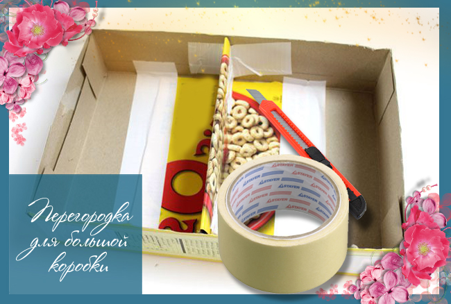 Коробки также можно разрезать вдоль. А затем из кусочка картона по центру сделать перегородку, приклеив ее при помощи малярного скотча.
