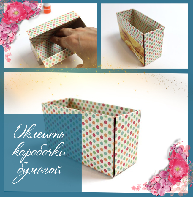 На следующем этапе каждую такую коробочку нужно оклеить бумагой для скрапбукинга или плотной упаковочной бумагой. Оклеивать коробки можно целиком – снаружи и внутри, а можно оклеить лишь внутреннюю часть и сделать запах на внешнюю стенку, чтобы прикрыть верхнюю кромку картона. Если коробочки не планируете склеивать вместе, то их нужно оклеить полностью и снаружи и внутри. Бумагу стоит нарезать по очереди отрезками согласно каждой стороне стенки коробочки, и так же по очереди их приклеивать. Бумагу можно фиксировать при помощи клея-геля «Момент» или при помощи клеевого карандаша. Ну а чтобы листочки крепко держались до полного приклеивания их можно зафиксировать канцелярскими скрепками или зажимами. По такой схеме нужно оклеить все подготовленные коробочки. Далее их все по желанию можно склеить вместе, но этот пункт нужен только в том случае, если вы не планируете вытаскивать коробочки с мелочами.