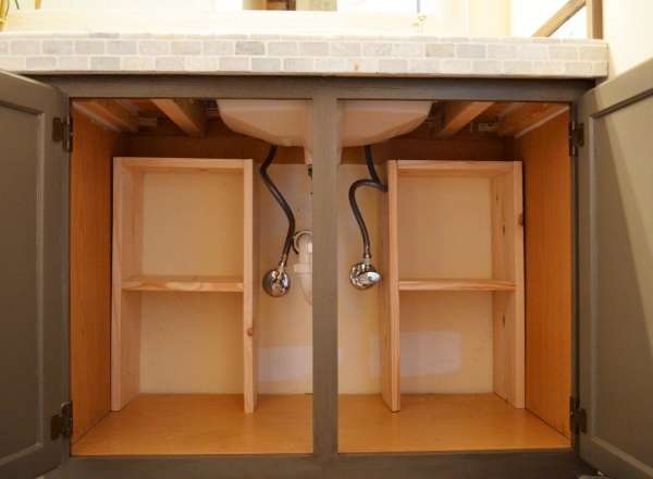 Пожалуй стоит отметить, что распашные дверцы в целом намного удобнее и проще при создании тумбы под раковину своими руками. При желании внутри можно разместить удобные полки, например, как это показано на фото ниже.